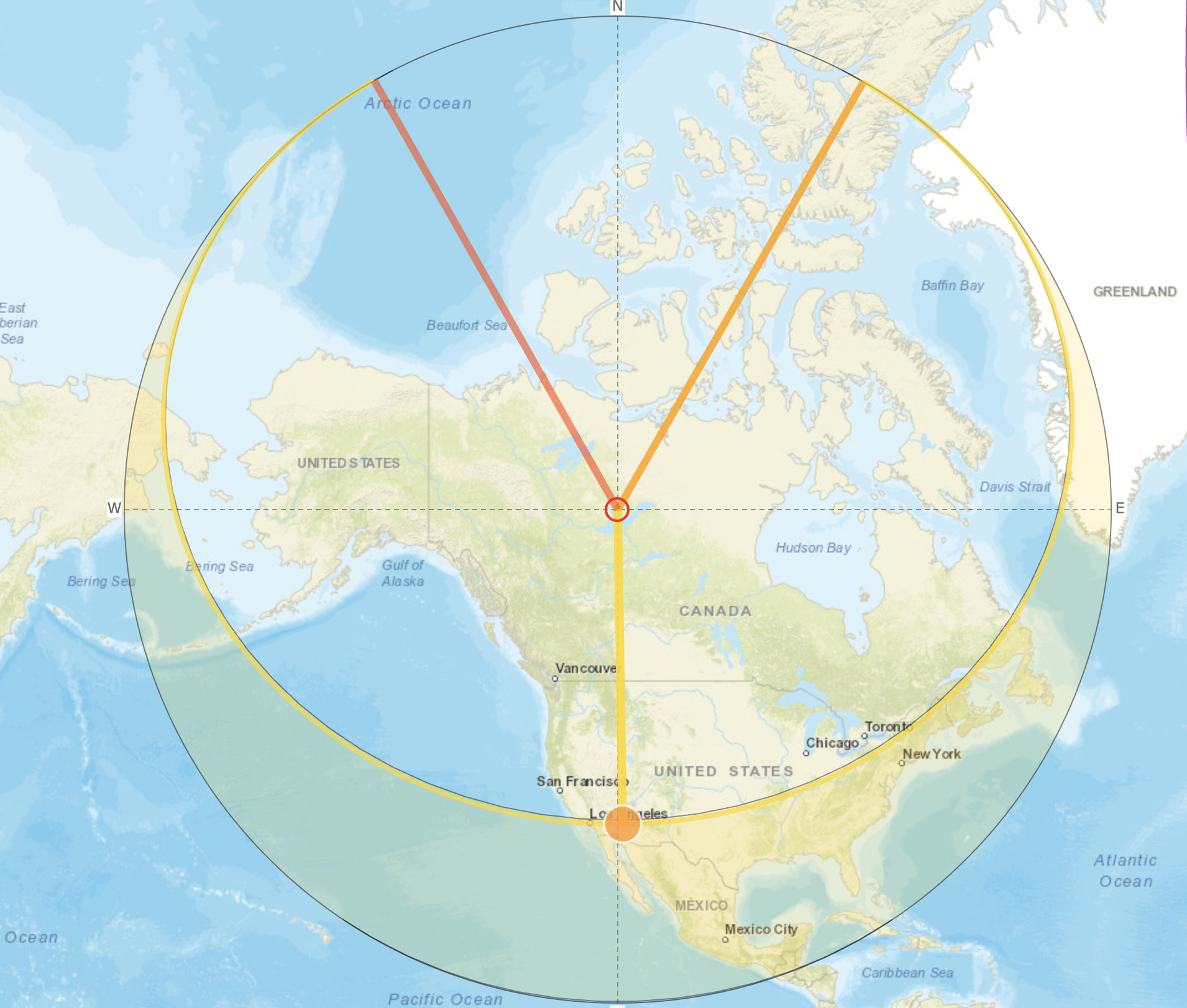 The observer is at the small circle in Yellowknife, Northwest Territories. The Sun rises along the light orange line, reaches solar noon along the yellow line, and sets along the dark orange line. Note that both sunrise and sunset occur north of the observer, while the Sun is due south at solar noon.